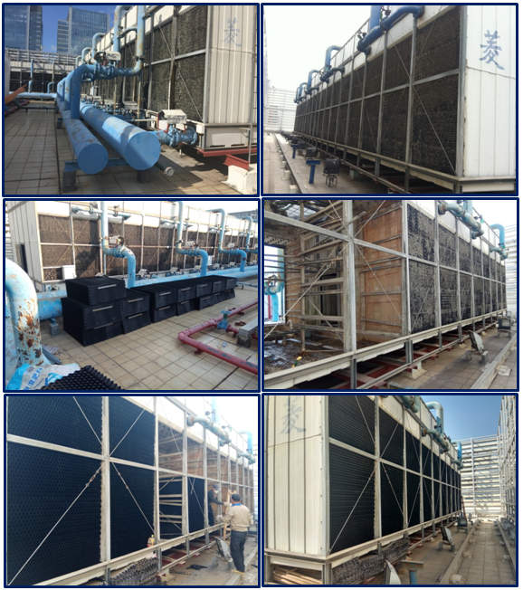 TCL總部大樓采購國內知名品牌,冷卻塔總冷量為6000冷噸,原生產廠家已經停止生產該款尺寸冷卻塔填料,管道多個部位均出現破裂漏水,我司排除專業技術團隊,在不停機狀況下完成整個升級改造,效果于新設備無異。
